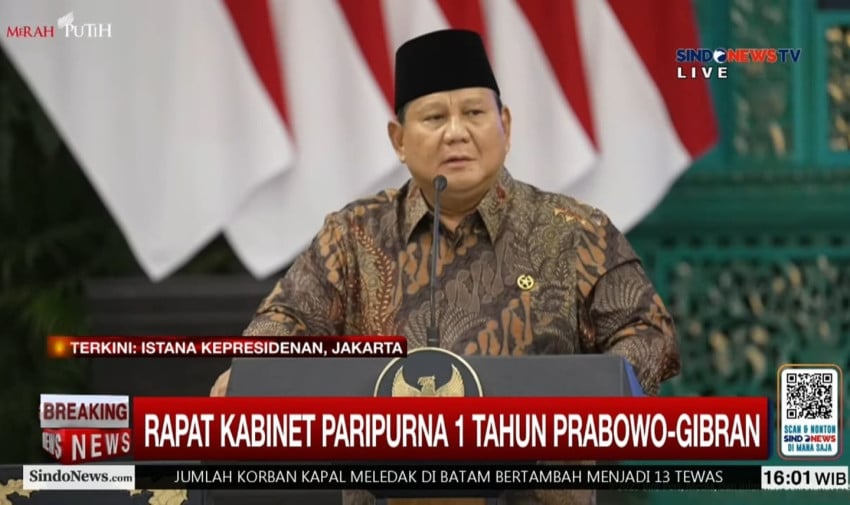 Presiden Prabowo Subianto memimpin Sidang Kabinet Paripurna di Istana Negara pada Senin (20/10/2025) hari ini tepat 1 tahun pemerintahan Prabowo-Gibran sejak dilantik tahun lalu. Foto/Tangkapan layar